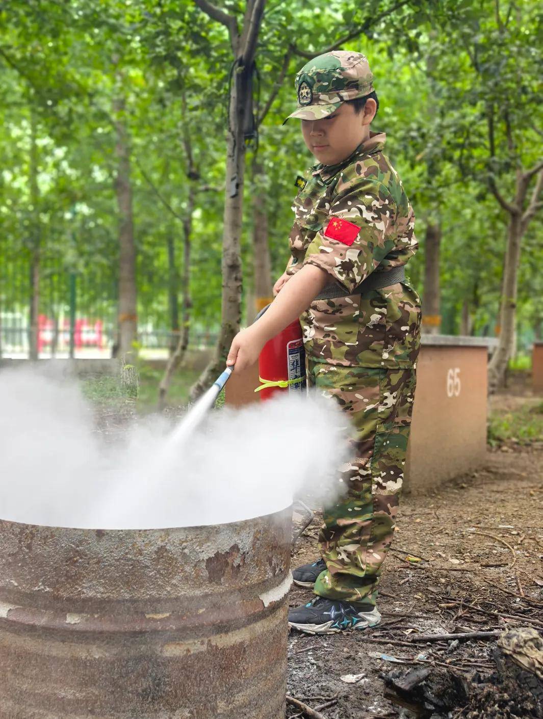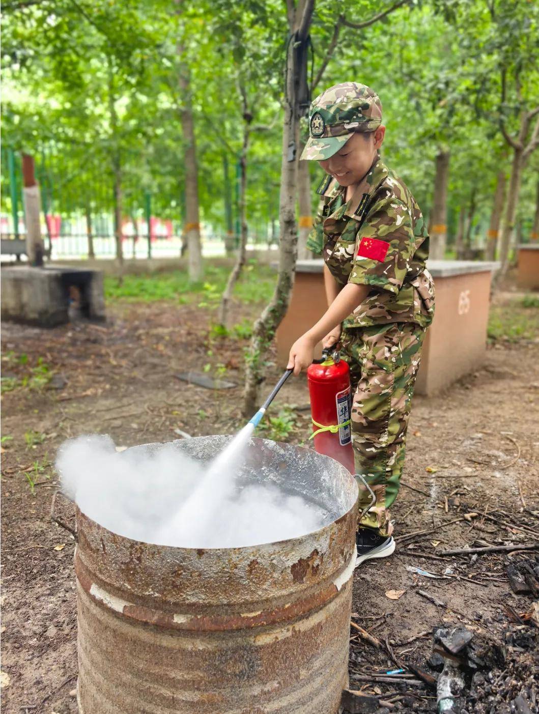 接下来,在教官的指导下,小营员们分组进行实操,颤抖着按下压把,成功将火扑灭,脸上绽放出自信的笑容。