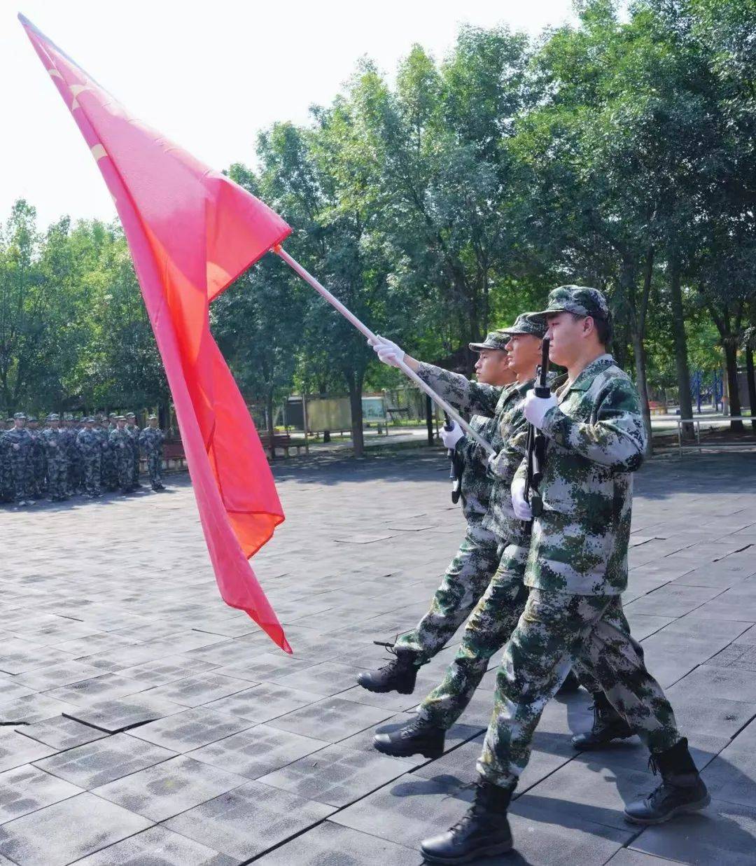 在激昂的军乐声中,护旗手们迈着整齐有力、铿锵作响的步伐,护送着鲜艳的军旗缓缓步入场地中央。